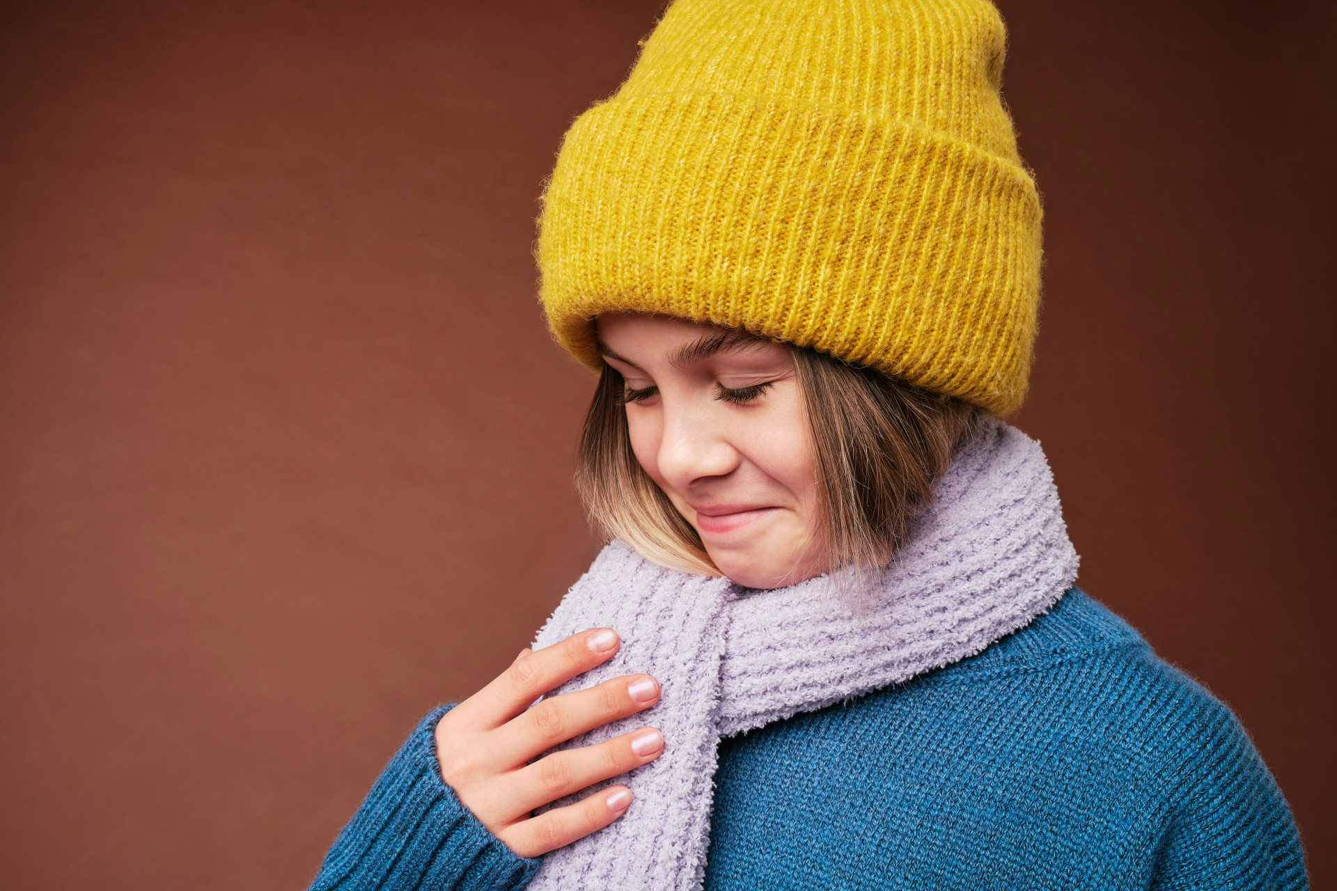 Jos pukeudut mattapintaisiin materiaaleihin, kuten puuvillaan tai denimiin, sileä huivi luo kauniin kontrastin. Vastaavasti villahuivi tuo syvyyttä ja lämpöä, jos muu asu on sileää kangasta, kuten satiinia tai nahkaa.